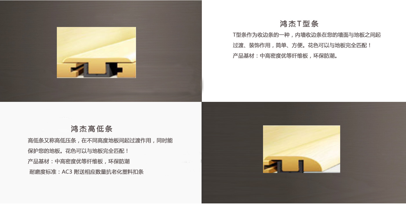 專業(yè)生產(chǎn)各類地板輔料。本廠成立于2008年,經(jīng)過嚴格的質(zhì)量控制,已開發(fā)出SPC、WPC、層壓板三種不同的壓花材料。每一種材料都有超過7種不同的過渡型材,如t型線、減速器、端蓋、四分之一圓、樓梯前鼻、樓梯板、踢腳板等。